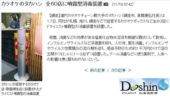 北海道新聞に全60店への噴霧型消毒装置設置の記事が掲載されました