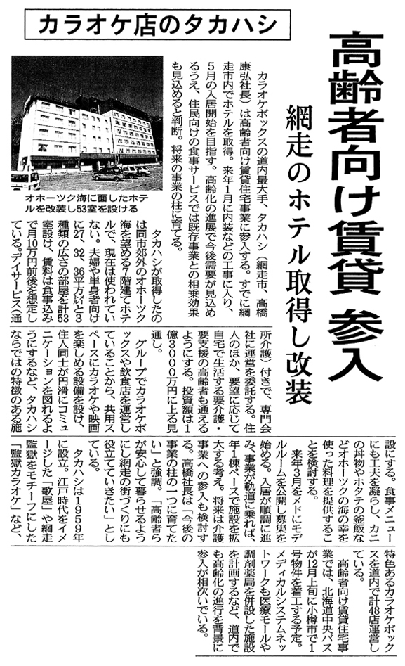 高齢者向け賃貸 参入 -網走のホテル取得