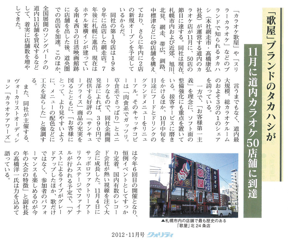 月刊クオリティ11月号に「歌屋」ブランド50店舗達成が掲載されました