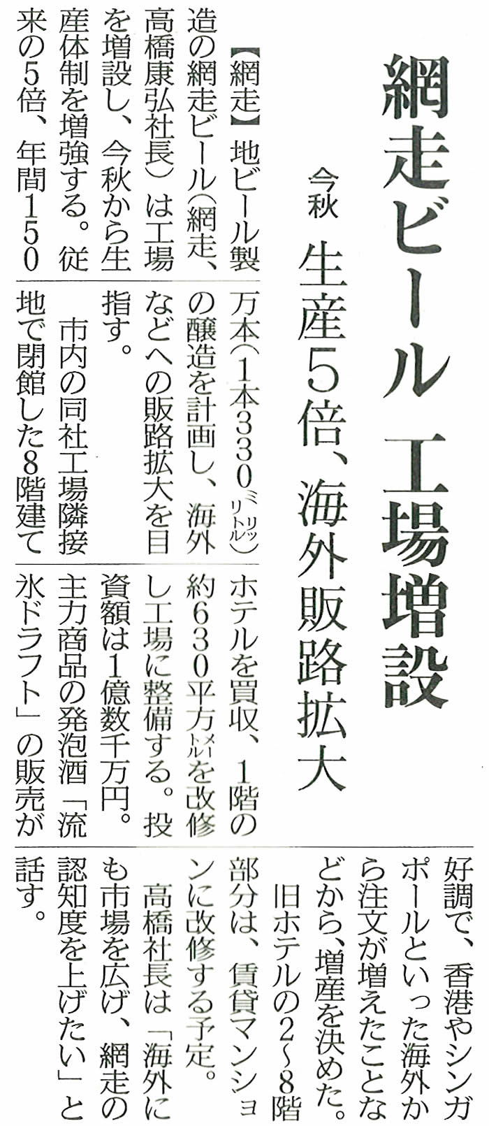 北海道新聞に網走ビール記事が掲載されました