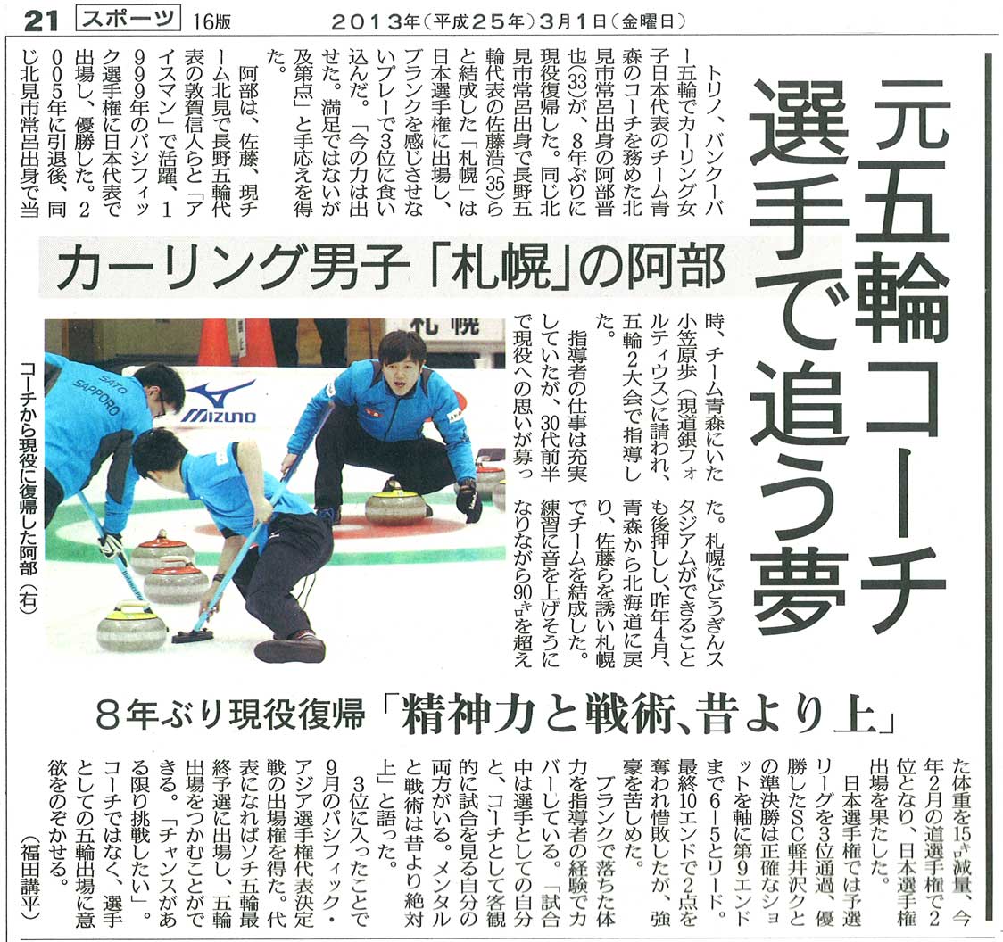 タカハシグループ所属のカーリング選手阿部晋也の記事が北海道新聞に掲載されました